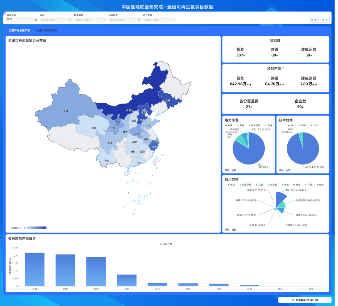 截至2023年12月25日,全国共建成可再生能源制氢项目58个,覆盖21个省(直辖市,自治区),涉及37家企业,合计项目规模654.5兆瓦。