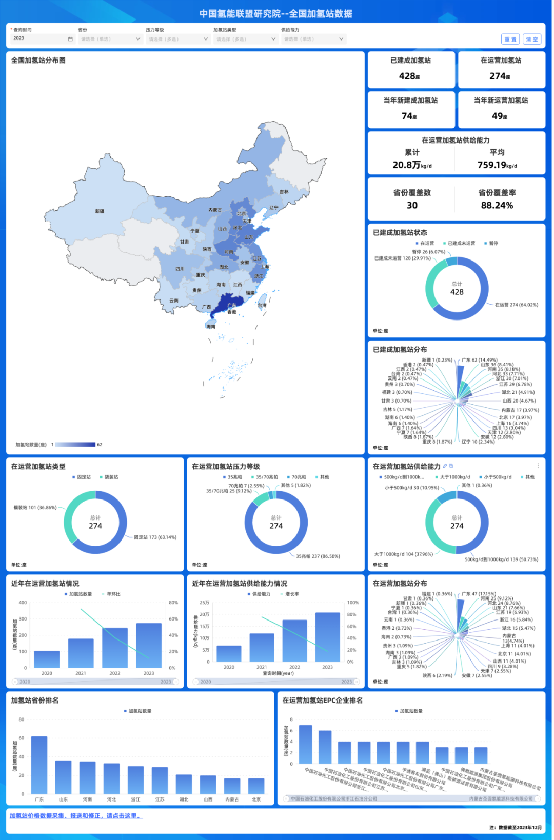 截至2023年12月25日,全国已建成并运营的加氢站数量达到了428座,与2022年底的358座相比,这一数字增加了70座。此外,这些加氢站已经覆盖了全国30个省市自治区,其中广东省、山东省、河南省、河北省和浙江省这五个省份的加氢站数量占比最高,合计达到了45.8%。在这些已建成的加氢站中,有274座处于运营状态,占比64.0%,累计供给能力达到了每天20.8万千克。在运营的加氢站中,固定站的数量为173座,占比63.1%。从压力等级来看,35兆帕的加氢站数量为237座,占比达到了86.5%。