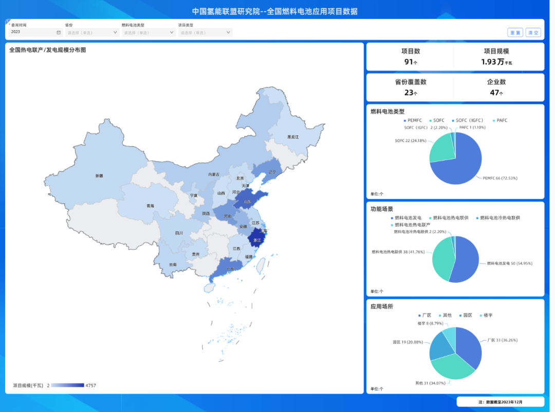 截至2023年12月25日,全国已建成运营燃料电池热电联产与发电项目91个,覆盖23个省(直辖市、自治区),总计规模达19.3兆瓦。其中,浙江省、山东省、广东省和辽宁省的排名分别为前四名。这些项目的燃料电池类型主要以质子交换膜燃料电池(PEMFC)为主,占比高达72.5%;功能场景以燃料电池发电为主,占比为55.0%;应用场景主要集中在厂区,占比为36.3%。