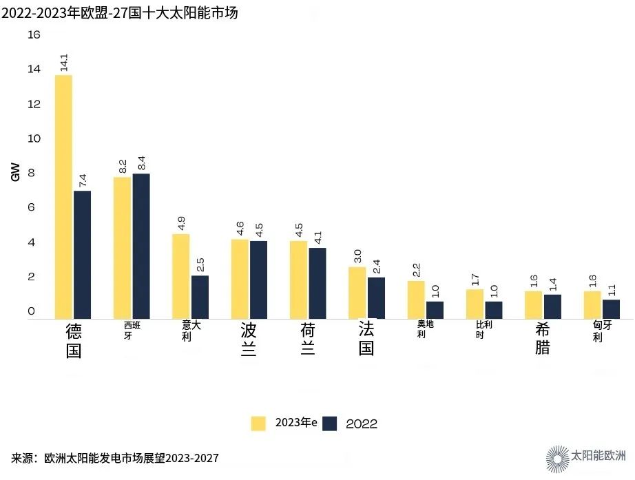 2023年,德国重新回到欧洲太阳能排名第一的位置,2023年装机容量为14.1 GW。之后是西班牙(8.2GW)、意大利(4.8GW)、波兰(4.6GW )和荷兰(4.1 GW)。