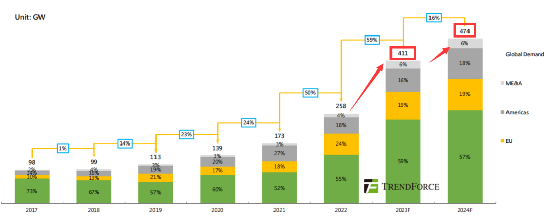 2023年12月13日,集邦咨询发布展望报告预测,2023年全球光伏新增装机411GW,同比增长59%;预计2024年新增装机474GW,同比增长16%,新增装机增速放缓,将从⾼速增⻓回归理性。