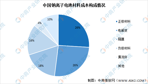 此外,从原料成本来看,钠离子电池成本较锂离子电池成本整体可降低30%~40%。钠离子电池材料成本构成中,正极材料及电解液占比最大,均达26%,隔膜占比18%,负极材料占比16%,集流体占比达4%。
