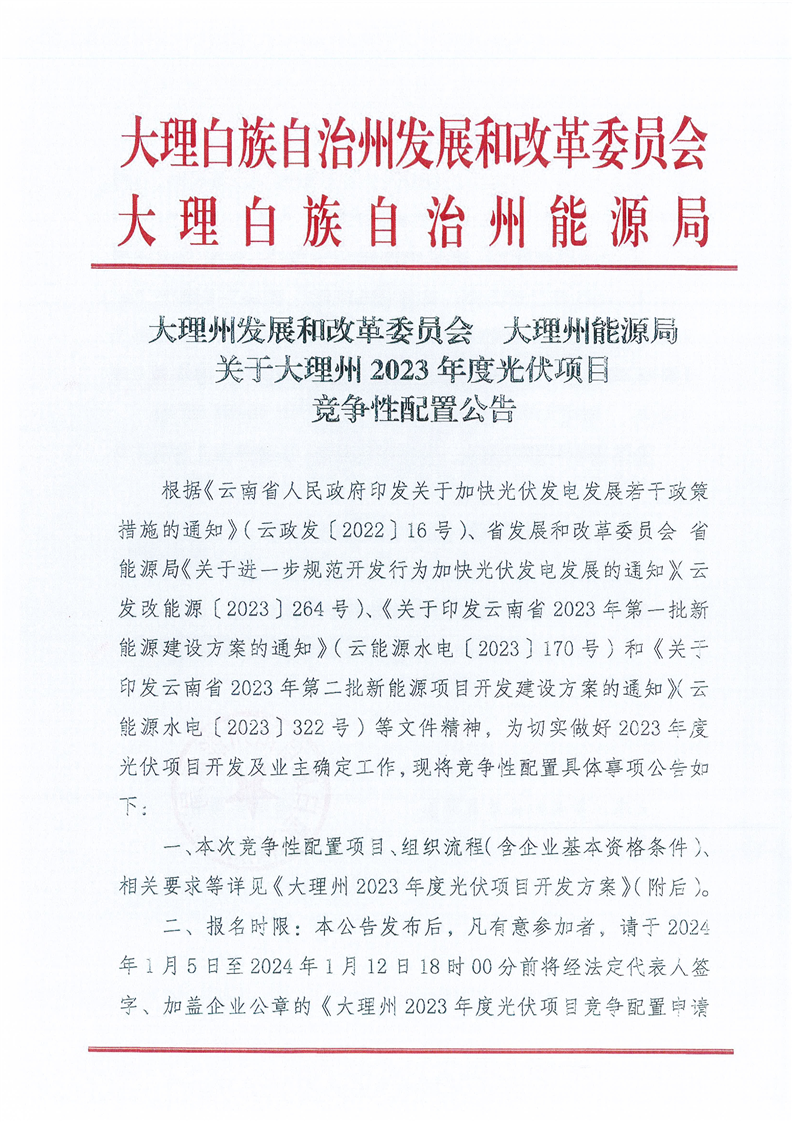 日前,大理白族自治州人民政府发布《大理州发展和改革委员会、大理州能源局关于大理州2023年度光伏项目竞争性配置公告》。