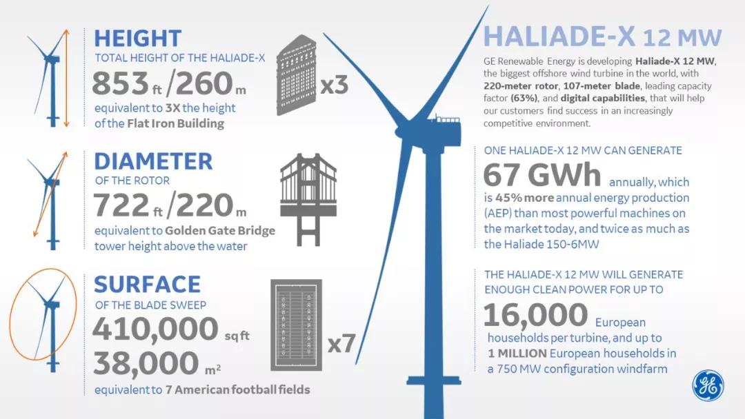 这就是巨头GE豪赌的全球最大风力发电机:Haliade-X 12MW海上风机。其装机容量直接跨越各厂商激烈争夺的8MW—10MW,达到骇人的12MW-14MW。