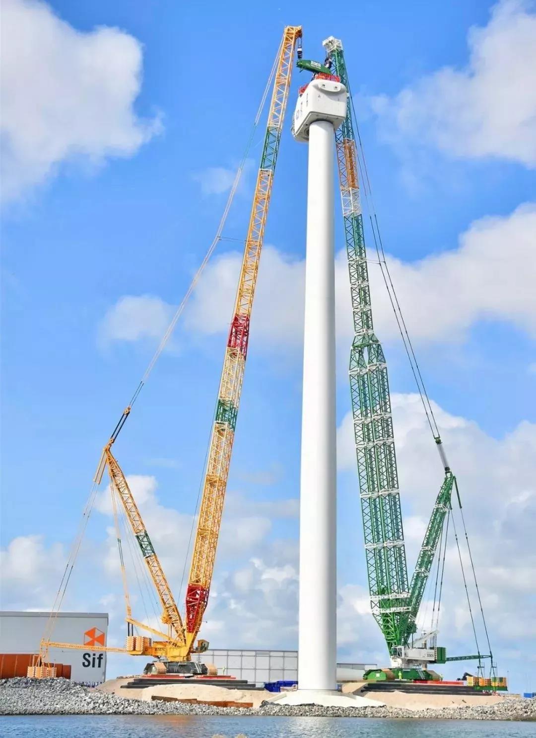 8月份在荷兰鹿特丹Maasvlakte的12MW样机上已经安装了机舱。完成这次吊装任务的是利勃海尔公司第二大型号的履带超级吊LR11350 ,起重能力为1350吨↓↓