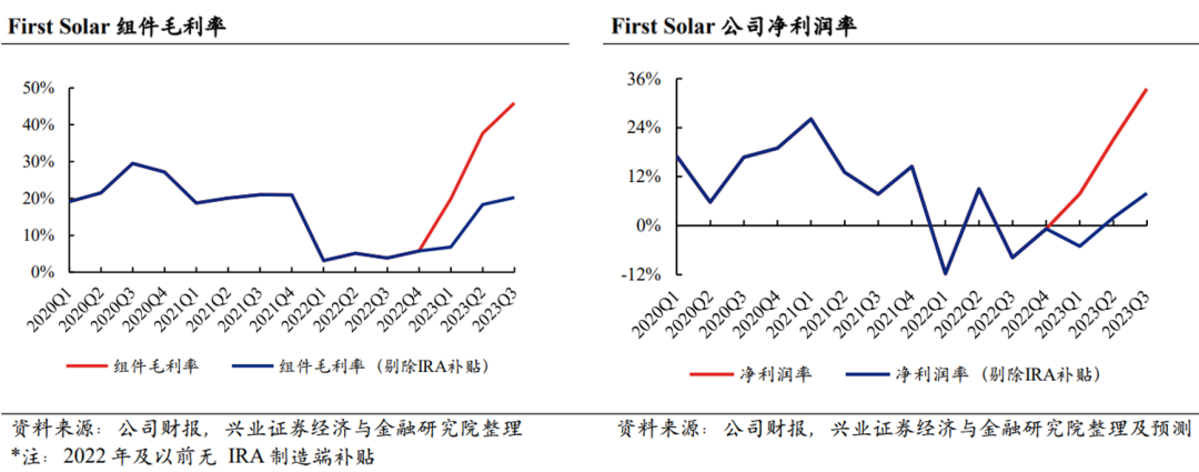 IRA 法案对美国光伏制造端提供补贴;鉴于薄膜组件为完全集成制造工艺,First Solar可同时获得类似晶硅体系下硅片、电池、组件环节的补贴, 折合17 美分/W,用以抵减销售成本。2023Q3,First Solar 的组件单价为 29.6 美 分/W、IRA 补贴是销售单价的57%。
