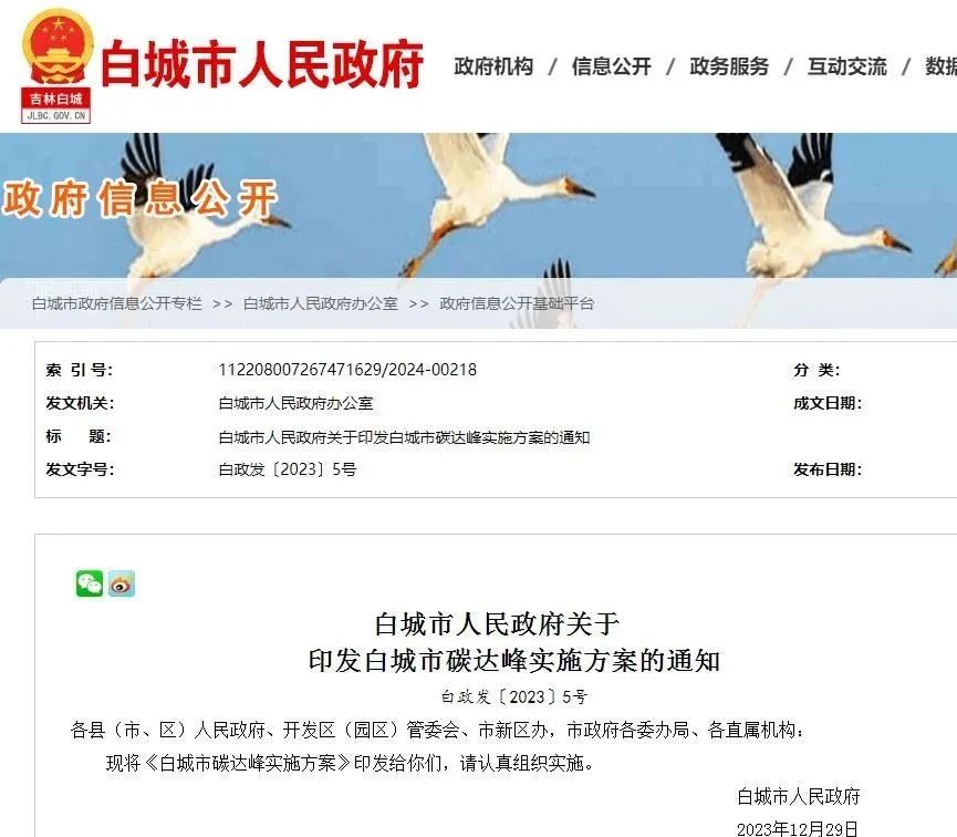 1月10日,吉林省白城市人民政府发布《白城市碳达峰实施方案》(简称《方案》)。