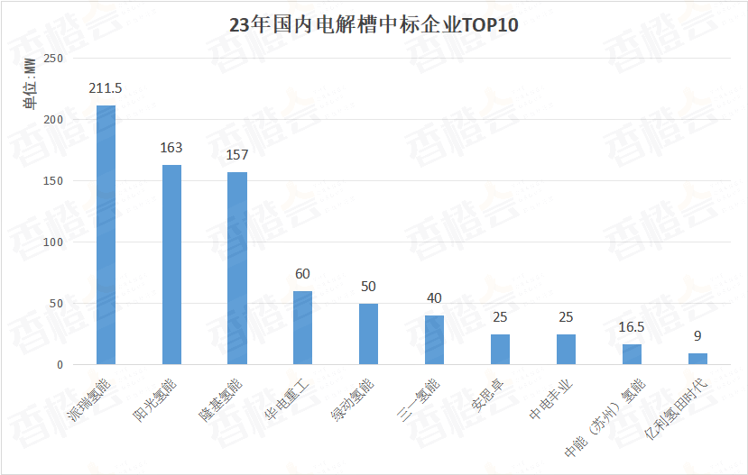 截至2023年12月31日,全年32个招标项目已经有30个公布了招标结果,实际中标量达到1055.5MW(若考虑中能建集中采购,实际中标量超过1620MW)其中中标规模前十的企业中,电解槽新势力9家,仅有派瑞氢能一家老牌电解槽厂商。