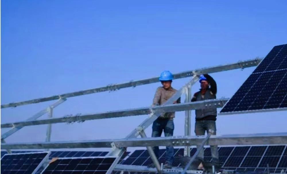 1月15日,吐鲁番市托克逊县乌斯通“光热+光伏”一体化项目现场,工人正紧张有序安装光伏板支架、光伏板组件,项目建设正在稳步推进。