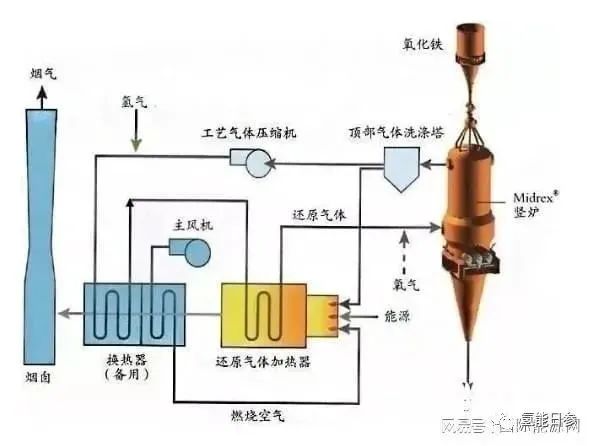 即通过使用氢气与一氧化碳混合气体作为还原剂,将铁矿石转化为直接还原铁,再将其投入电炉进行进一步冶炼。氢气作为还原剂的加入使碳排放得到了有效控制。相较于富氢还原高炉,每吨二氧化碳排放量可减少50%以上。这种方式更适合用于氢冶金。