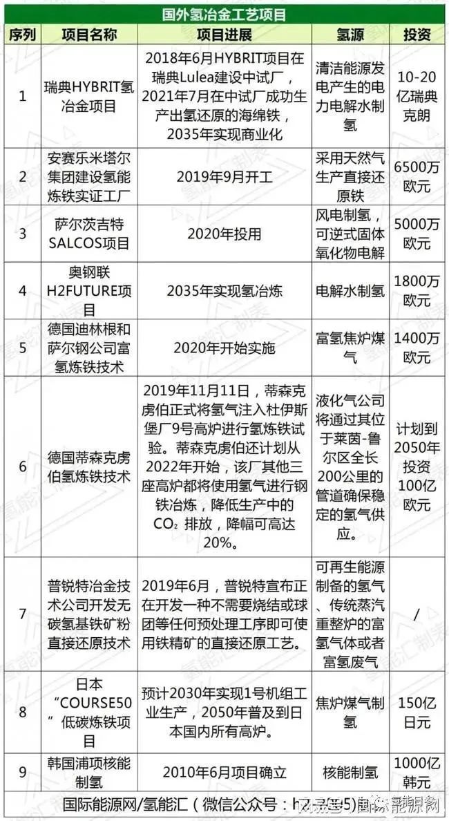 目前全球已经有部分氢冶金技术的案例,例如瑞典酐铁HYBRIT项目、萨尔茨吉特SALCOS项目、奥钢联H2Future项目、德国蒂森克虏伯Carbon2Chem项目等。