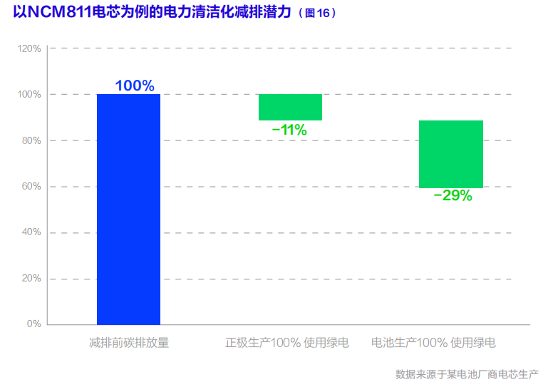 根据联合国全球契约组织GDI发布的《动力电池碳足迹及低碳循环发展白皮书》(下称白皮书),相较于传统电力排放因子,由于绿电完全由可再生能源生产,其排放因子几乎为0。针对某中国工厂生产的NCM811电池,若其生产过程中用电全部由电网直供变为绿电,则可在其生命周期减少30%的碳排放。