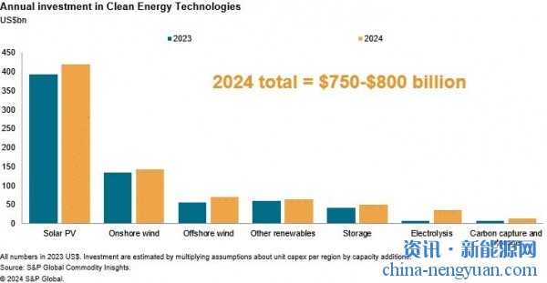 标普全球商品洞察预测,2024年清洁能源技术(CET)投资近8000亿美元,如果实现,将比2023年的支出水平增长10%至20%。太阳能将在额外支出中占据最大份额,约占总投资的55%。就绝对投资而言,陆上风电将是第二大细分市场,但增长速度将更慢。新投资增长最快的领域将是电池储能和水电解制氢。