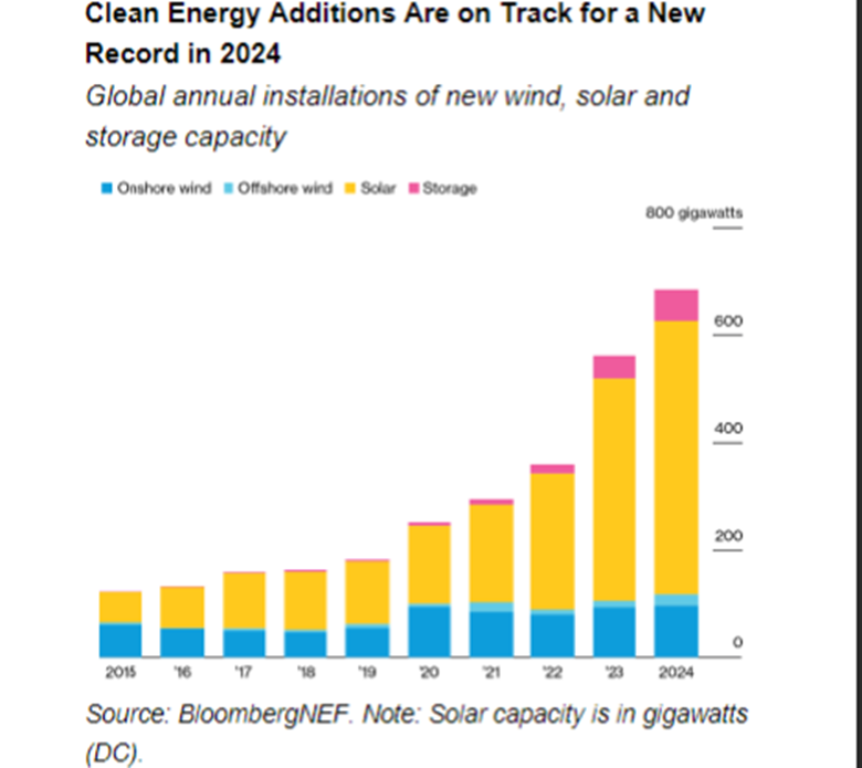 在这个目标引领下,以及在前几年的市场需求惯性下,彭博新能源财经(BNEF)预测,2024 年全球风能、太阳能和储能装机量将超过680 GW,比2023年增长22%。