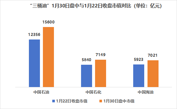 1月29日,“三桶油”股价再度走高,中国石油、中国石化双双在盘中一度涨超3%,中国石油股份、中国石油化工股份盘中涨近3%,中国海油、中国海洋石油盘中涨超2%。截至1月30日发稿,“三桶油”继续呈现上涨态势,“三桶油”市值(相比1月22日)已合计增加5440亿元。