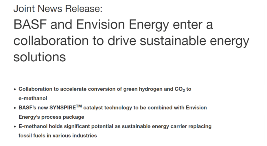 1月29日,德国化工巨头巴斯夫宣布,将与全球领先的绿色科技企业远景科技集团合作,加速绿氢和二氧化碳(CO2)向电制甲醇(E-methanol,又称“绿色甲醇”)的转化,以促进全球可再生能源转型。