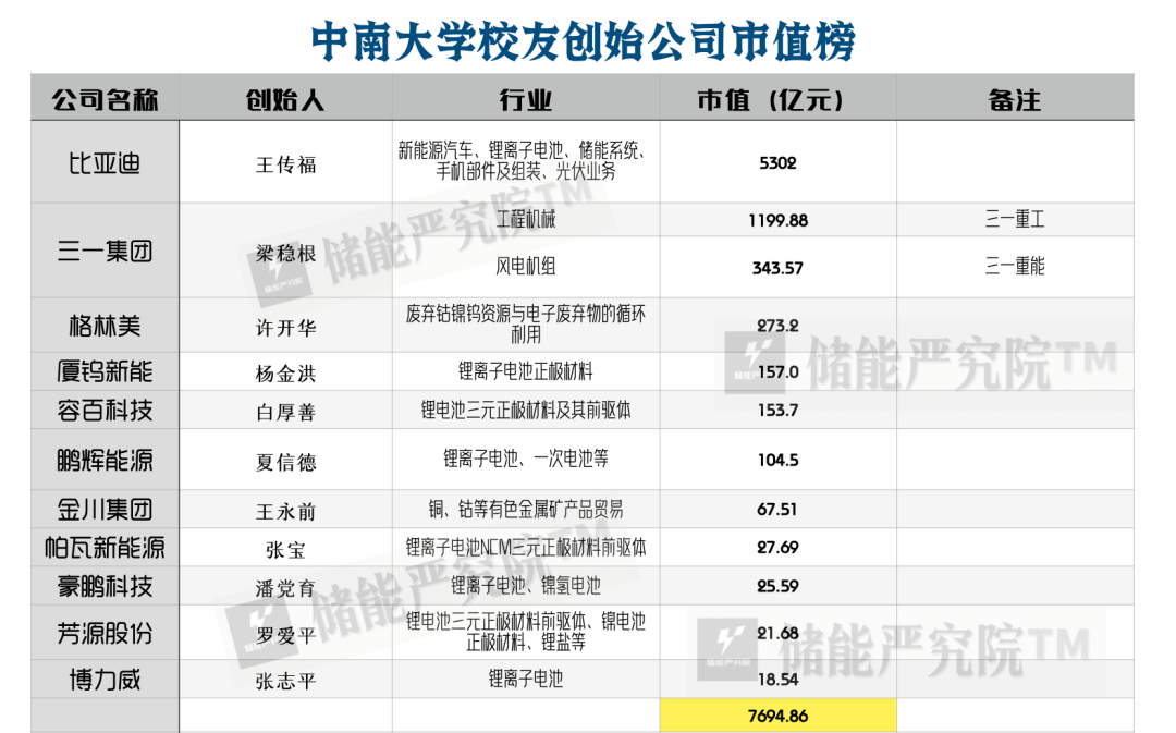 据「储能严究院」梳理,来自中南大学校友的上市公司市值总计已超过7600亿元。