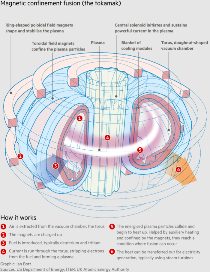 在一个巨大的甜甜圈形反应堆中,轻氢同位素(氘和氚)被加热,直到它们达到等离子体的状态,这是一种非常低密度的气体。与此同时,磁铁限制旋转的等离子体气体,防止其与腔室壁接触,而原子碰撞并开始融合。
