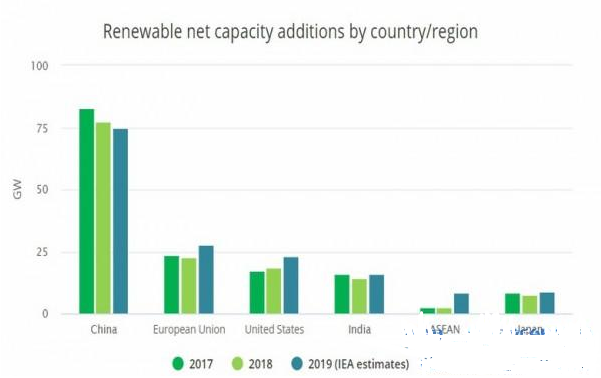 国际能源署预测,2019年,尽管中国太阳能发电量略有下降,但光伏行业的新增装机容量将升至近115GW,今年将是太阳能光伏发电量首次突破100GW大关。欧盟(EU)将出现改善,其中西班牙、越南、印度、美国和日本将成为几个最大的市场。
