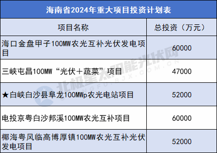 其中,包含5个光伏重点项目,项目分别为:海口金盘甲子100MW农光互补光伏发电项目、三峡屯昌100MW“光伏+蔬菜”项目、白峡白沙县阜龙100MWp农光电站项目、电投京粤白沙邦溪100MW农光互补项目、椰海粤风临高博厚镇100MW农光互补光伏发电项目,上述光伏重点项目总投资27.1亿元,总装机500MW。