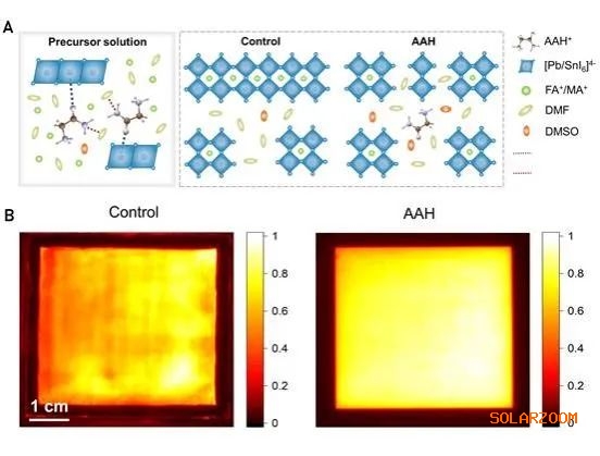 图1. 大面积窄带隙钙钛矿薄膜的均匀制备。(A)甘氨酰胺盐酸盐与钙钛矿的相互作用示意图;(B)甘氨酰胺盐酸盐对钙钛矿薄膜均匀性的提升。