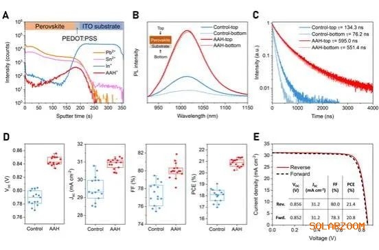进一步,甘氨酰胺盐酸盐在前驱体溶液中的高溶解度可以诱导其自发聚集在钙钛矿薄膜的底部界面处,减少底部界面处的缺陷密度,大幅提升钙钛矿薄膜的载流子寿命,将可量产技术制备的铅锡窄带隙单结钙钛矿电池的光电转换效率从18.9%提升至21.4%(如图2所示),这是目前报道涂布技术制备的最高效率,为高效率全钙钛矿叠层组件的制备奠定了技术基础。