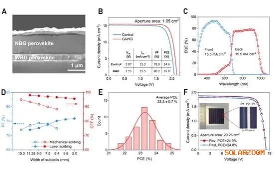 结合上述优化思路,研究团队将甘氨酰胺盐酸盐制备的窄带隙子电池与宽带隙子电池结合构筑全钙钛矿叠层电池(如图3A)。为实现大面积组件中各个子电池的有效串联,优化了P1、P2、P3等激光划刻,获得了更大的光电响应活性区域,基于此,研究团队构筑了高效率大面积全钙钛矿叠层组件(如图3F所示)。