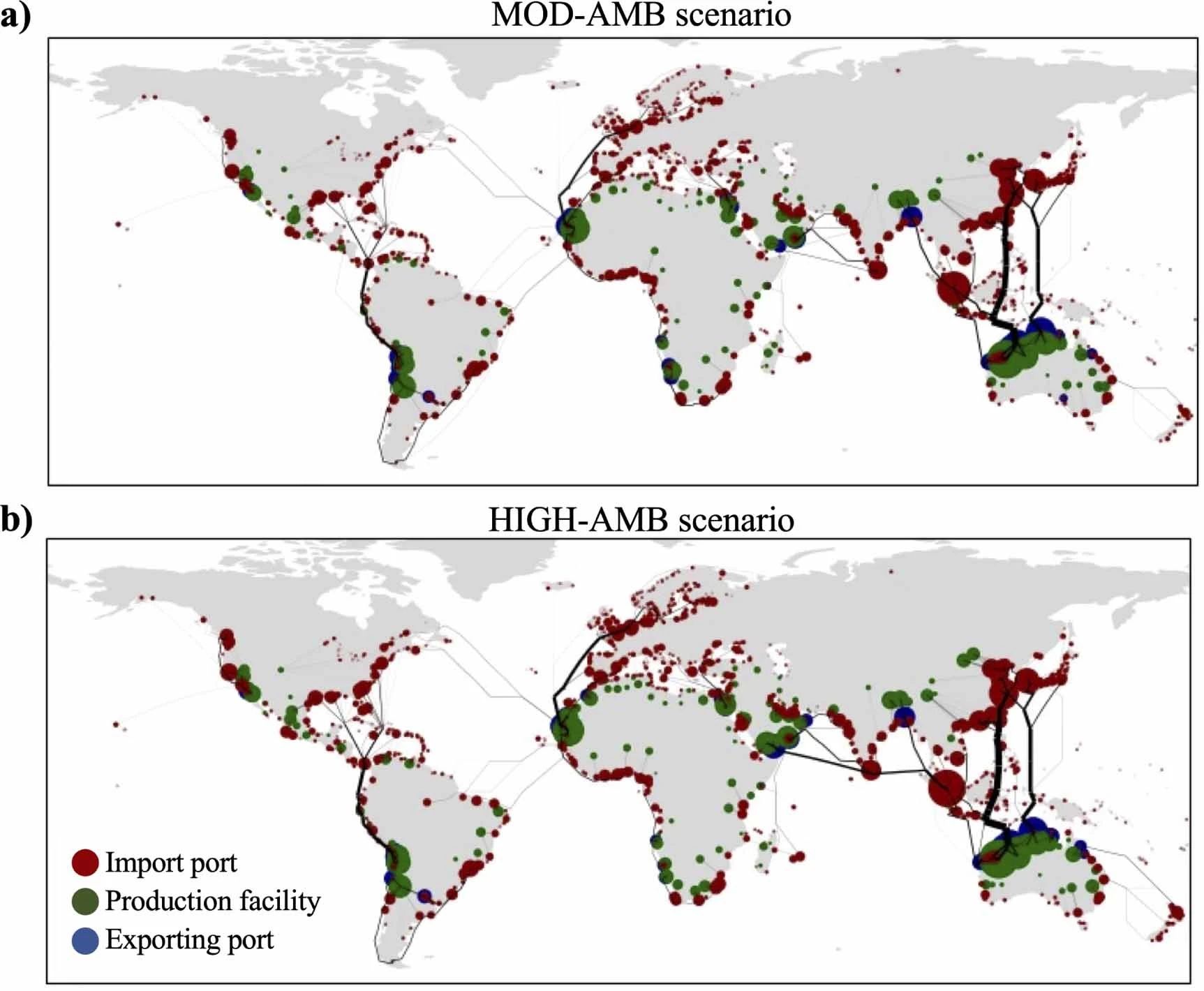 图说:MOD-AMB和HIGH-AMB情景下满足全球港口绿氨燃料需求的最优燃料供应链(绿色表示生产地点,蓝色表示燃料出口港,红色表示燃料需求港)