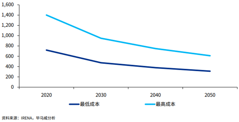 首先要确保绿氨的供应。现阶段绿氨成本仍然较高,不具备竞争优势。2020年,绿氨的生产成本区间为720-1400美元/吨,通过煤等化石燃料制取的灰氨成本则为280-440美元/吨。即使煤炭价格处于历史高点,绿氨成本比灰氨高,不具备竞争优势。不过,随着可再生能源发电成本的下降及风光电氢氨一体化技术的成熟,绿氨的成本将显著降低。