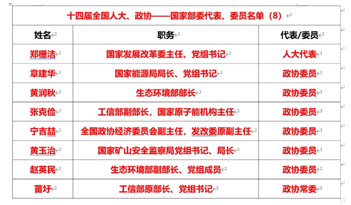 国家部委层面,有国家发展改革委党组书记、主任郑栅洁,生态环境部部长黄润秋,国家能源局局长、党组书记章建华,国家矿山安全监察局党组书记、局长黄玉治,工信部副部长,国家原子能机构主任张克俭,全国政协经济委员会副主任,生态环境部副部长、党组成员赵英民,国家发改委原副主任宁吉喆,工信部原部长、党组书记苗圩8人。