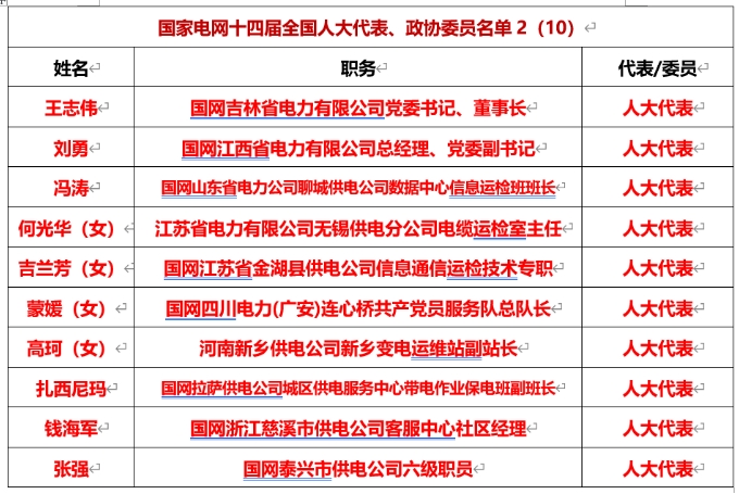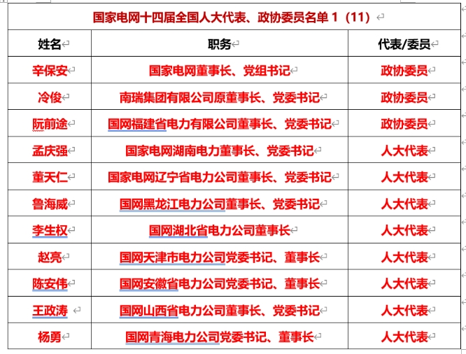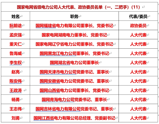 据初步统计,目前两大电网的代表、委员有24名,其中国家电网21名,南方电网3名。国家电网、南方电网一把手均当选为十四届全国政协委员,其他9位省级电力公司一把手或基层员工当选了人大代表。