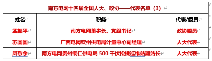 (1)孟振平南方电网董事长、党组书记(政协委员)