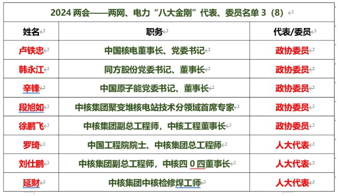 电力“八大金刚”当中,中国华电和国家能源集团各4名、中国华能和国家电投各3名,中国大唐2名,中核集团8名,中国广核集团和三峡集团各1名。