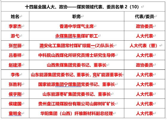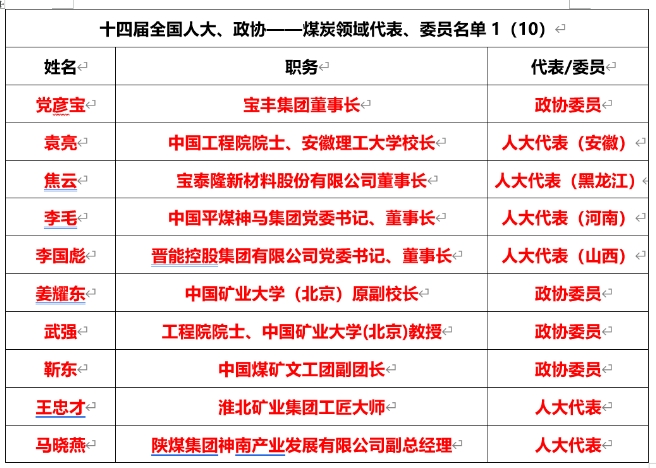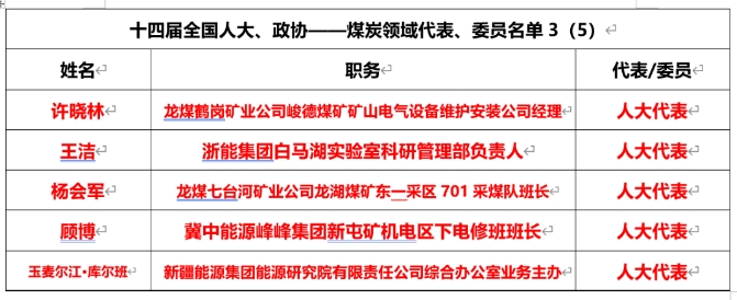 煤炭领域有25人当选十四届全国人大代表、政协委员,全国人大代表有19名,全国政协委员有6名。