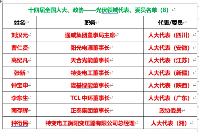 光伏领域共有8位行业领袖当选十四届全国人大代表、政协委员,数量创历年之最。其中,特变电工有2人当选,单家公司最多。