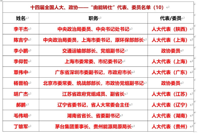 “由能转仕”的十四届全国人大代表、政协委员有10人,其中全国人大代表8人,政协委员2人。如中央政治局委员、中央书记处书记李干杰,曾任生态环境部原部长、党组书记,中央政治局委员、上海市委书记陈吉宁曾任环保部部长,交通运输部部长李小鹏曾任中国华能总经理,上海市委常委、纪委书记李仰哲曾任国家能源局副局长,深圳市长覃伟中曾任中国石油副总经理,辽宁省委书记郝鹏曾任国务院国资委主任,江苏省副省长胡广杰曾任中国海油副总经理,湖南省省长毛伟明曾任国家电网董事长,丁雄军曾任贵州能源局原局长。