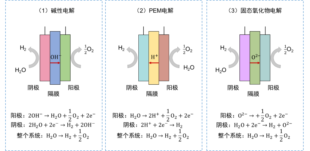 电解水制氢技术主要包括碱性电解水(ALK),质子交换膜电解水(PEM)和固体氧化物电解水(SOE)以及其他电解水技术。前三者的基本原理如下图所示。