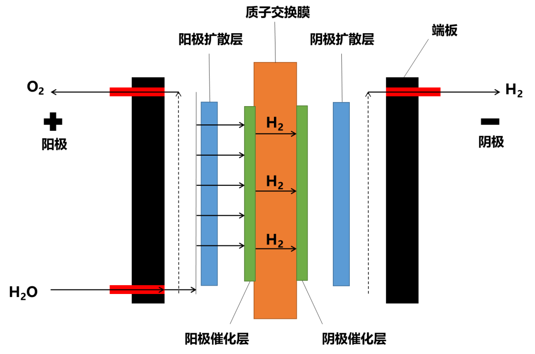 PEM电解水制氢系统由PEM电解槽和辅助系统(BOP)组成。PEM电解槽由质子交换膜、催化剂、气体扩散层和双极板等零部件组装而成。电解槽的最基本组成单位是电解池,一个PEM电解槽包含数十至上百个电解池。