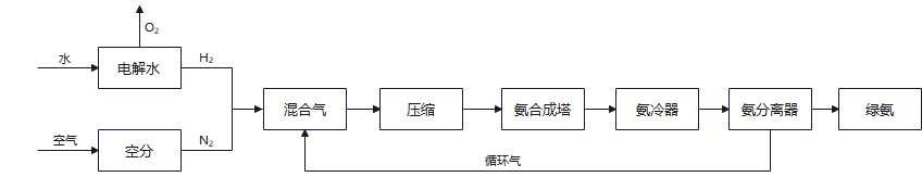 目前绿氨大部分的制备方式基于Haber-Bosch合成法,用绿氢和氮气在催化剂作用下合成为绿氨,工艺主要分为三部分:氢气氮气压缩、氨合成及冷凝分离、氨压缩冷冻。