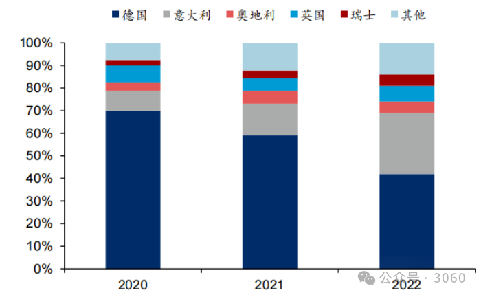 欧洲储能市场中,德意占据近7成市场。根据SolarEurope,2021年欧洲户储新增装机容量2.29GWh,同比+106.8%,累计装机5.4GWh。2022年,欧洲新增户储TOP4分别为德国、意大利、英国、奥地利,其中德国仍然是欧洲户储装机量最高的地区,占比42%,意大利户储新增装机量占比有明显提升,比27%。