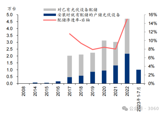 户用光伏装机量高增,为户储装机提供基础,同时光伏装配比例创新高是户储装机增长的主要来源。根据Sunwiz统计,22年小型储能装机共4.71万台,折算的当年新增储能套数/光伏套数约15.0%,同比+7.0pct。根据Australia Energy Council统计,22年有配储的小型光伏设备2.17万台,约占储能装机总数的46.0%,即对原有光伏设备配储的占比约为54.0%,约各占一半。