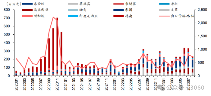 图:中国向东南亚逆变器月度出口量(百万元)和价格