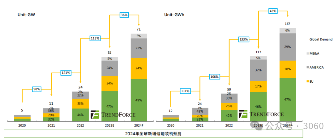 展望2024年,从全球户储的增速来看,TrendForce集邦咨询旗下储能研究中心预计,2024年全球新增储能装机的细分类别将呈现——工商储(93%/112%)>大储(39%/43%)>户储(4%/11%)的态势。其中户储在用电价格以及天然气价格双双回落的背景下,居民对于装机的迫切性有所减弱,在增速表现上较2023年明显放缓,同比增长仅为11%。