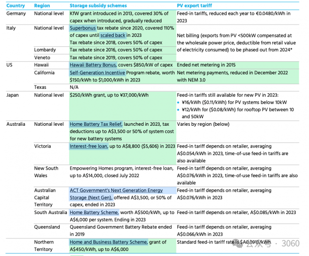 表 1:主要地区户用电池储能驱动因素比较 资料来源:Bloomberg NEF。注:绿色=支持户用储能普及的主要驱动因素。*=意大利对新光伏系统的净计费政策将于2024年1月1日终止,而现有系统需要在2024年年底前逐步转为补偿较低的计划,补偿金额约为100欧元/MWh,具体取决于生产时间和地区。日本的光伏输出电价适用于10-50kW的光伏系统。