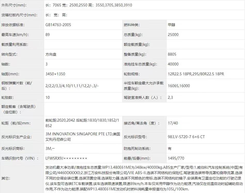 经济方面,在公示中提到潍柴动力WP13.480E61ME甲醇发动机的百公里燃料消耗量为105L,换算为质量约为83公斤,根据甲醇燃料2元公斤的市价来算,百公里燃料消耗平均能比燃气车型少4元,比燃油车少114元。虽然甲醇牵引车的运营成本与燃气牵引车相差不大,但是甲醇燃料具有价格稳定的特性,如此看来,甲醇燃料相比起来还是占有优势的。