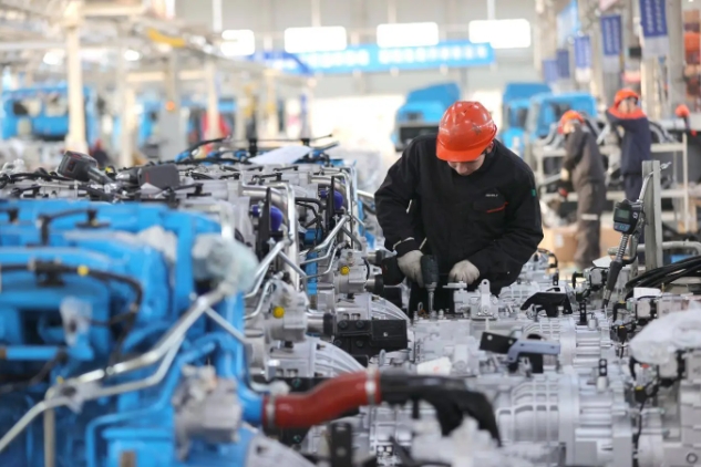 在吉利汽车晋中基地甲醇重卡生产车间里,工人正在安装发动机组件。