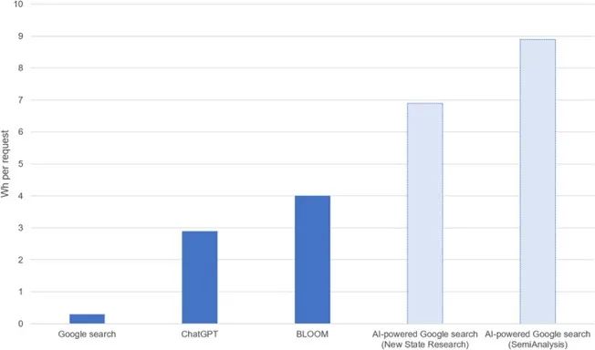 图说:与标准 Google 搜索相比,各种人工智能驱动系统的每个请求的估计能耗。