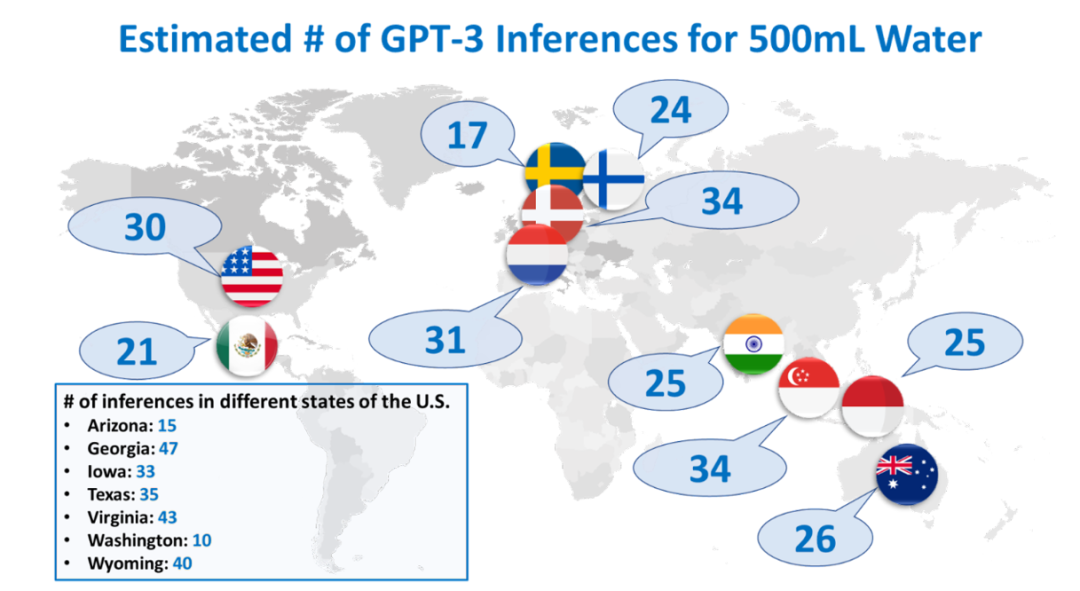 图说:全球不同地区每 500mL用水量(范围1和范围2)的GPT-3 推断数量