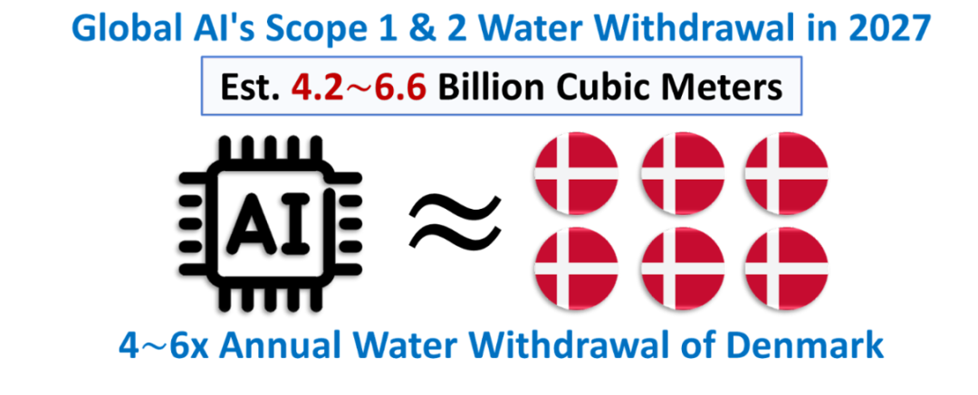 对于未来,任绍磊的团队预计,到2027年,全球人工智能可能需要4.2-66亿立方米的清洁淡水量,这比4-6个丹麦或一半英国的年取水总量还要多。如果美国承载着全球一半的人工智能工作量,那么人工智能的运行可能会占用其每年总取水量的约0.5%至0.7%。同时,全球人工智能范围1和范围2的总耗水量可能超过0.38-6亿立方米,即大约相当于丹麦一半的年取水量或2.5-3.5个利比里亚的年取水量。
