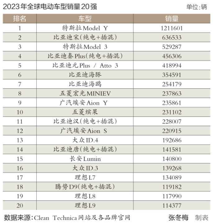 得益于降价提振销量,2023年特斯拉Model Y以逾120万辆的交付量,不仅蝉联全球电动汽车销量桂冠,同时也成为全球最畅销的车型。这也是纯电动车型首次登上全球汽车销量榜首,可以说是汽车产业加速走进电动汽车时代的重要转折点。此前,全球最畅销车型通常“花落”丰田旗下的卡罗拉或RAV4。另外,特斯拉另一款主力车型Model 3,在2023年全球电动车型销量20强榜单中位列第三。